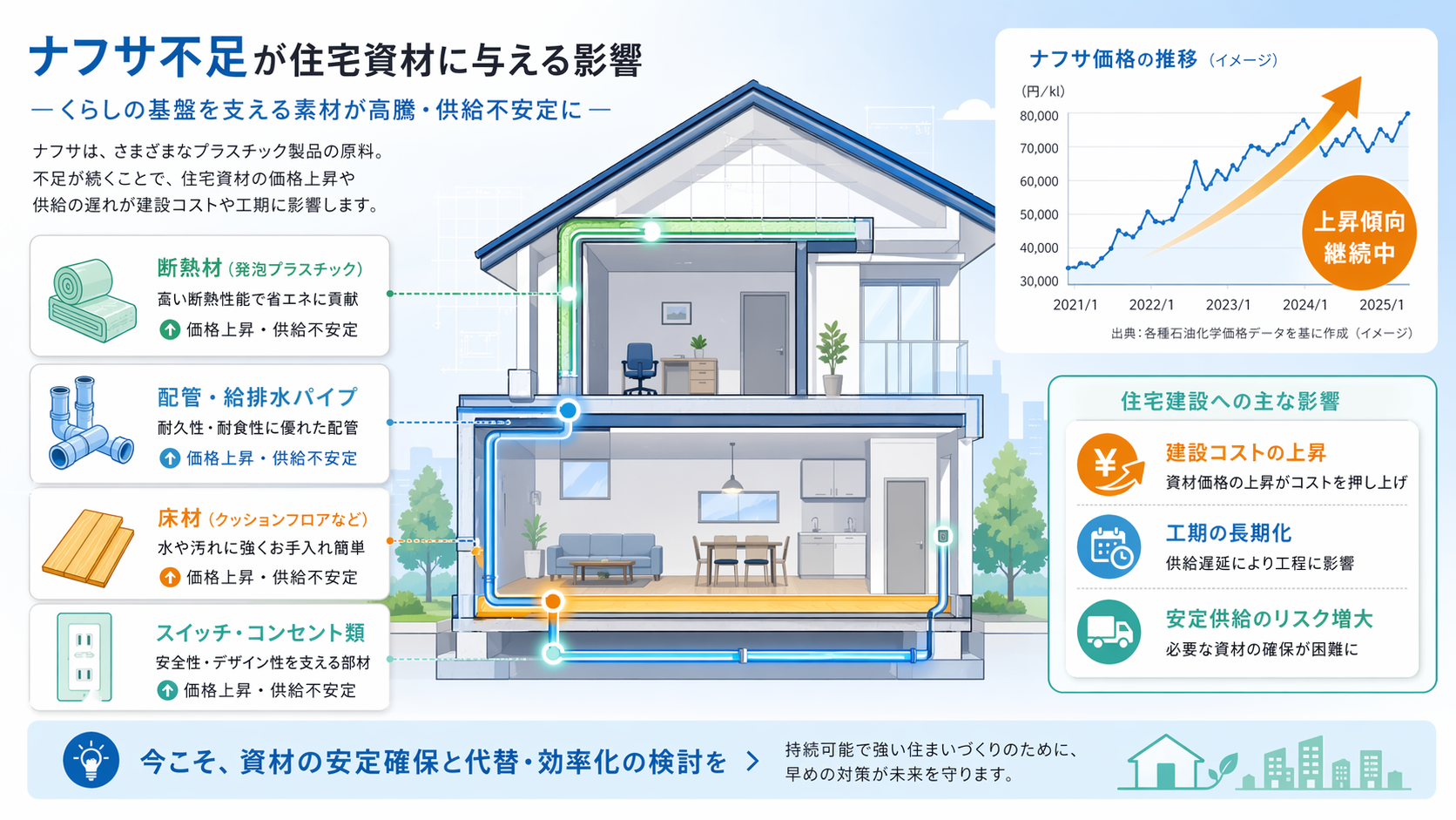 増改築.com – ナフサショック(ナフサ不足)完全解説2026|石油化学製品が住宅から消える日