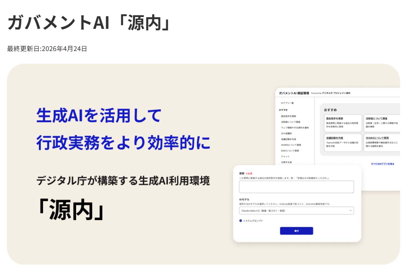2026年度、全府省庁の約18万人の政府職員を対象とした大規模実証が本格化するデジタル庁のガバメントAI「源内」ですが、2026年4月24日、そのWebインターフェース部分や一部のAIアプリの実装テンプレートがGitHub上で商用利用可能な形でOSSとして公開されました。