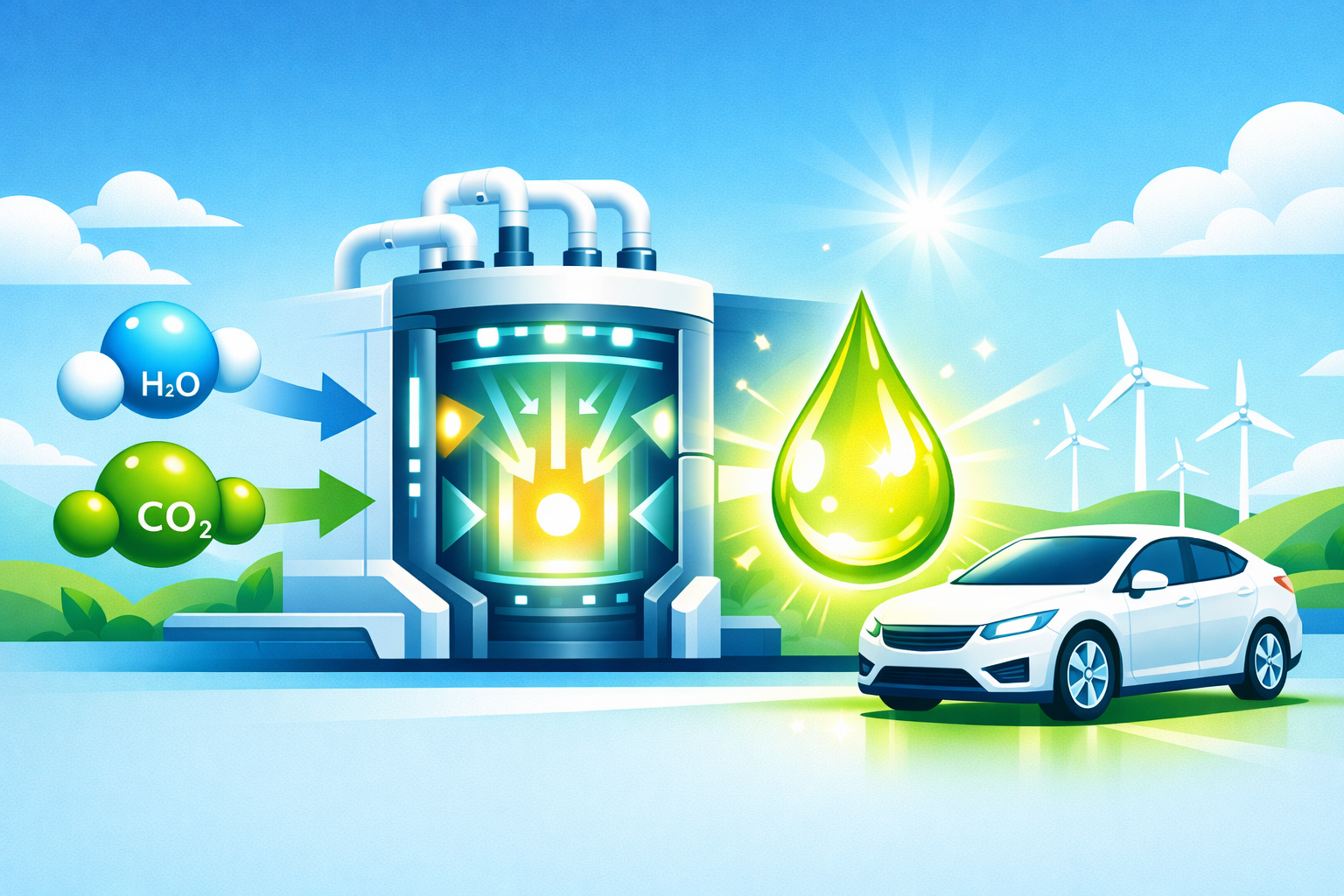 ガソリンなどの化石燃料は、地球の地中深くで何億年もかけて作られた炭素と水素の塊です。これを車で燃やすから二酸化炭素が出て地球温暖化が進むわけですが、合成燃料は逆転の発想を使います。発電所や工場から出る二酸化炭素と、太陽光などのクリーンなエネルギーで作った水素を、巨大な工場で化学反応させて人為的につなぎ合わせ、石油と全く同じ成分を作り出すのです。これなら、車で燃やして二酸化炭素が出ても、もともと空気中から回収した二酸化炭素を使っているので、プラスマイナスゼロの計算になります。